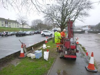 Dynamic sampling (windowless sample boreholes) was utilised in a scheme of works for the proposed stabilisation and reinstatement of a quay wall. This was the preferred method for the initial geotechnical investigation at this site, as they allowed representative samples of the near surface soils to be obtained, facilitated Standard Penetration Tests (SPTs) and were able to be progressed down to depths of 6m-8m to determine the presence of engineering rock-head, all whilst keeping site disturbance and the areal extent of the site works to a minimum, allowing the adjacent car park to be in continued use without the need for closure.